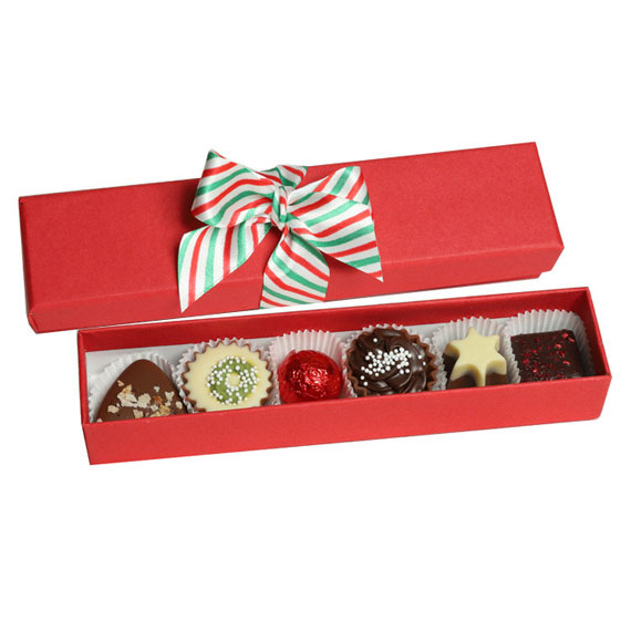These exquisite chocolates manufactured by Belgian and Swiss chocolatiers are presented in a red box with a bauble print ribbon.